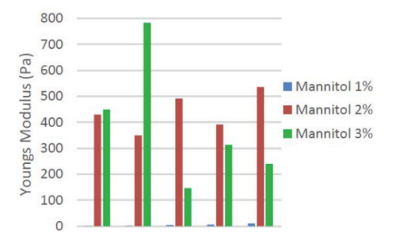 圖4:不同濃度的甘露醇(左)和葡聚糖(右)得到的平均楊氏模量結(jié)果