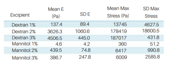 甘露醇的濃度從1%增加到2%的過(guò)程中,楊氏模量(Youngs Modulus)從最弱到最強(qiáng)增加了近10倍(圖4左)。但從3%甘露醇的強(qiáng)度并不比2%高 ,相反3%甘露醇凍干餅的平均楊氏模量降低了,但相比2%濃度的標(biāo)準(zhǔn)偏差有所增加,樣本之間的差異變得更大。圖4右顯示提升葡聚糖濃度的結(jié)果是得到了比甘露醇強(qiáng)得多的凍干餅,且葡聚糖的濃度從1%到3%,凍干餅的楊氏模量增加了107%,發(fā)生變形所需的力倍增。由于蛋糕的整體強(qiáng)度超過(guò)了MicroPress 的測(cè)量范圍,無(wú)法確定其能承受的最大應(yīng)力。然而,這可以通過(guò)更小直徑的壓頭來(lái)解決,以確保能達(dá)到被測(cè)量?jī)龈蓸悠返淖畲髴?yīng)力。