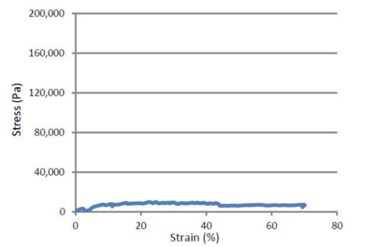 延伸階段以10mm/s的速度將壓頭移動(dòng)到預(yù)估凍干餅高度的5mm以內(nèi);定位階段找到蛋糕的頂部;一旦檢測(cè)到頂部,就會(huì)開始擠壓凍干餅,然后記錄施加在凍干餅上的力。從圖3(左)可以看出,3%葡聚糖顯示出彈性特性,這個(gè)特性由減壓階段從40%應(yīng)變返回到18%應(yīng)變的曲線得到證明。
