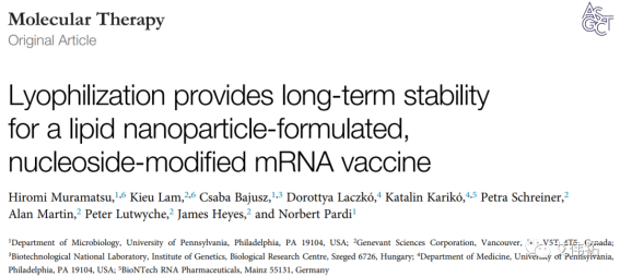 賓夕法尼亞大學(xué)與德國(guó)BioNTech學(xué)者共同在Molecular Therapy發(fā)表過(guò)一篇文章:Lyophilization provides long-term stability for a lipid nanoparticle-formulated, nucleoside-modified mRNA vaccine。