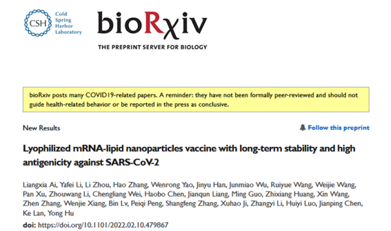 瑞科吉生物的凍干劑型mRNA-LNP新冠肺炎疫苗采用LNP遞送系統(tǒng),應(yīng)用自主開(kāi)發(fā)的冷凍干燥技術(shù)實(shí)現(xiàn)了4℃和25℃條件下的制劑穩(wěn)定性。該疫苗可在常規(guī)冷鏈條件下貯存與運(yùn)輸,很大地提高了疫苗的可及性。研究成果已在 bioRxiv 在線發(fā)布,題為Lyophilized mRNA-lipid nanoparticle vaccines with long-term stability and high antigenicity against SARS-CoV-2。