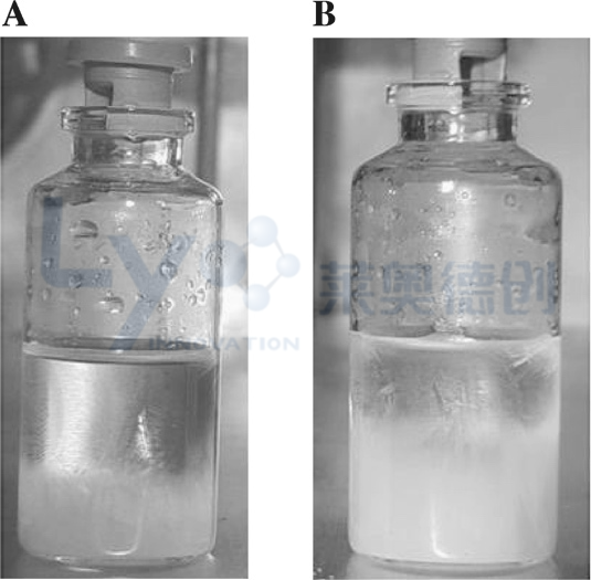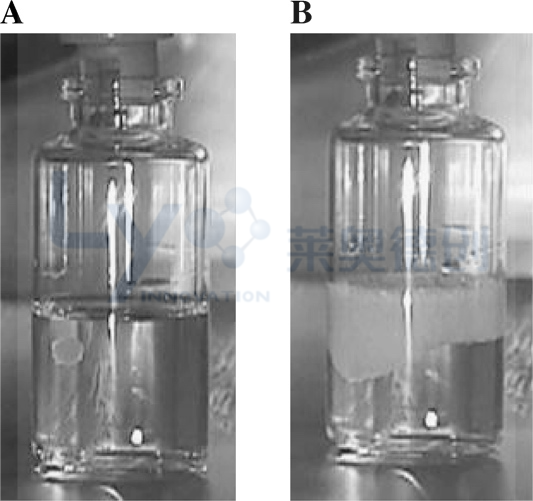 圖3:?jiǎn)尾嚼鋬龉に嚨腟BECD+5%TBA的冷凍行為照片A:冰晶脫離并浮起;照片B:快速自上而下凍結(jié)