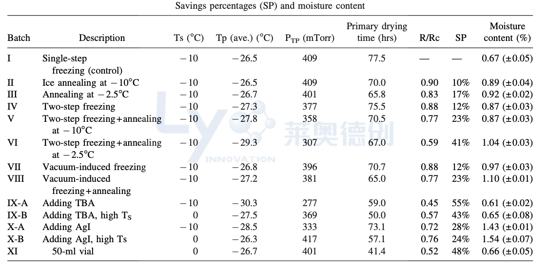 含水量數(shù)據(jù)匯總于下表。退火處理、兩步冷凍及真空誘導(dǎo)冷凍會(huì)使冷凍干燥產(chǎn)品的含水量略有上升,而添加碘化銀的干燥餅塊含水量則增加了一倍。這可能是由于這些冷凍方式增大了冰晶尺寸和/或形成了互聯(lián)冰晶結(jié)構(gòu),從而減少了總表面積,導(dǎo)致二次干燥階段的解吸速率降低。盡管添加叔丁醇改變了冰晶形態(tài),但有趣的是,批次IX的含水量與對(duì)照組并無(wú)顯著差異。批次IX的實(shí)驗(yàn)結(jié)果表明,在此案例中更換更大規(guī)格的西林瓶并未對(duì)終產(chǎn)品含水量產(chǎn)生影響。