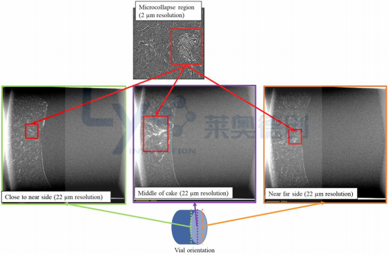 ● 圖5證實了粉餅壁變形和微觀餅狀結(jié)構(gòu)塌陷,并且來自三個不同樣本的顯微CT圖像,縱向切片(近側(cè)、蛋糕中部和遠側(cè))顯示凍干NOCIN產(chǎn)品在高度和寬度方向上均存在高比例的微觀結(jié)構(gòu)變化;蛋糕中部的微觀結(jié)構(gòu)變化更為顯著;