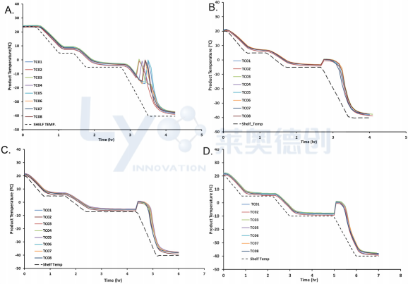 圖1:預(yù)凍階段熱電偶(TC)溫度讀數(shù)顯示:(A)隨機冰核形成(NO CIN)與受控冰核形成過程在(B)-5℃(CIN-5℃)、(C)-7℃(CIN-7℃)及(D)-10℃(CIN-10℃)