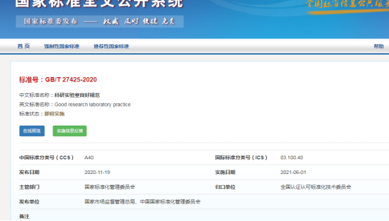 中國(guó)國(guó)家標(biāo)準(zhǔn)化管理委員會(huì)平臺(tái)發(fā)布了《科研實(shí)驗(yàn)室良好規(guī)范》(GB/T27425-2020)標(biāo)準(zhǔn),2021年06月01日起實(shí)施,此《科研實(shí)驗(yàn)室良好規(guī)范》規(guī)定了科研實(shí)驗(yàn)室良好規(guī)范(簡(jiǎn)稱GRLP),包括管理要求和技術(shù)要求,是有關(guān)科研實(shí)驗(yàn)室運(yùn)行、運(yùn)行條件以及研究活動(dòng)的計(jì)劃、實(shí)施、檢查、記錄、存檔和報(bào)告的一套規(guī)范體系,彌補(bǔ)了國(guó)內(nèi)科研實(shí)驗(yàn)室良好規(guī)范領(lǐng)域的空白。