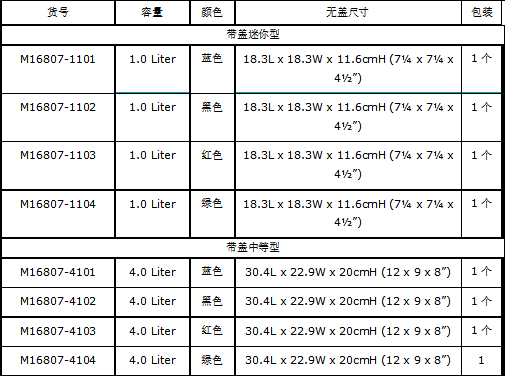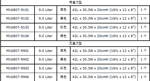 ? 有迷你的1.0升、中等的4.0升和最大的9.0升尺寸,每種尺寸有四種顏色:藍色、黑色、紅色和綠色